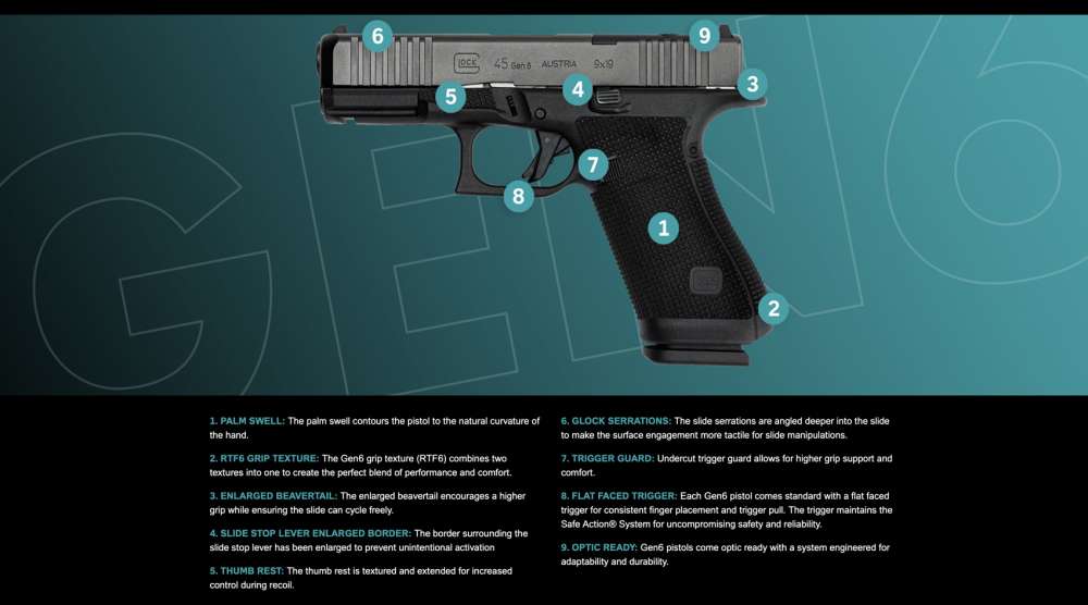 The generation 6 Glock is available now in Model 17, 19, and 45, all in 9mm.